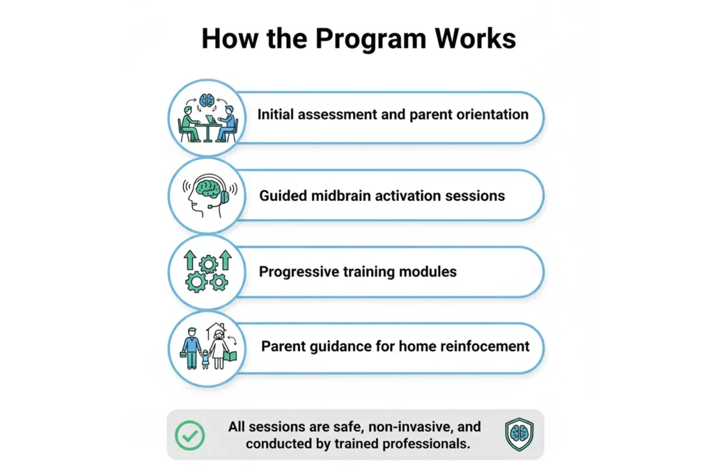 This enables institutions and practitioners to deliver consistent, ethical, and structured midbrain activation programs.